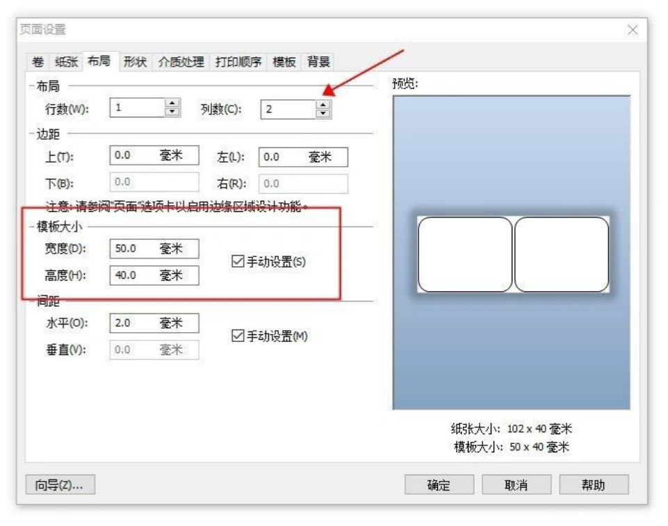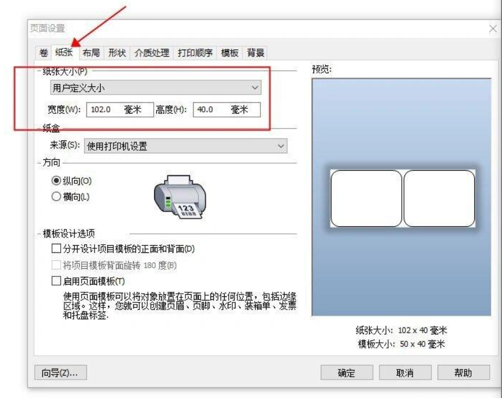 2、新建标签时或右键页面设置里设置纸张大小,纸张的宽等于模板的宽*2 +间距,高不变,则纸张大小为宽102mm,高40mm。